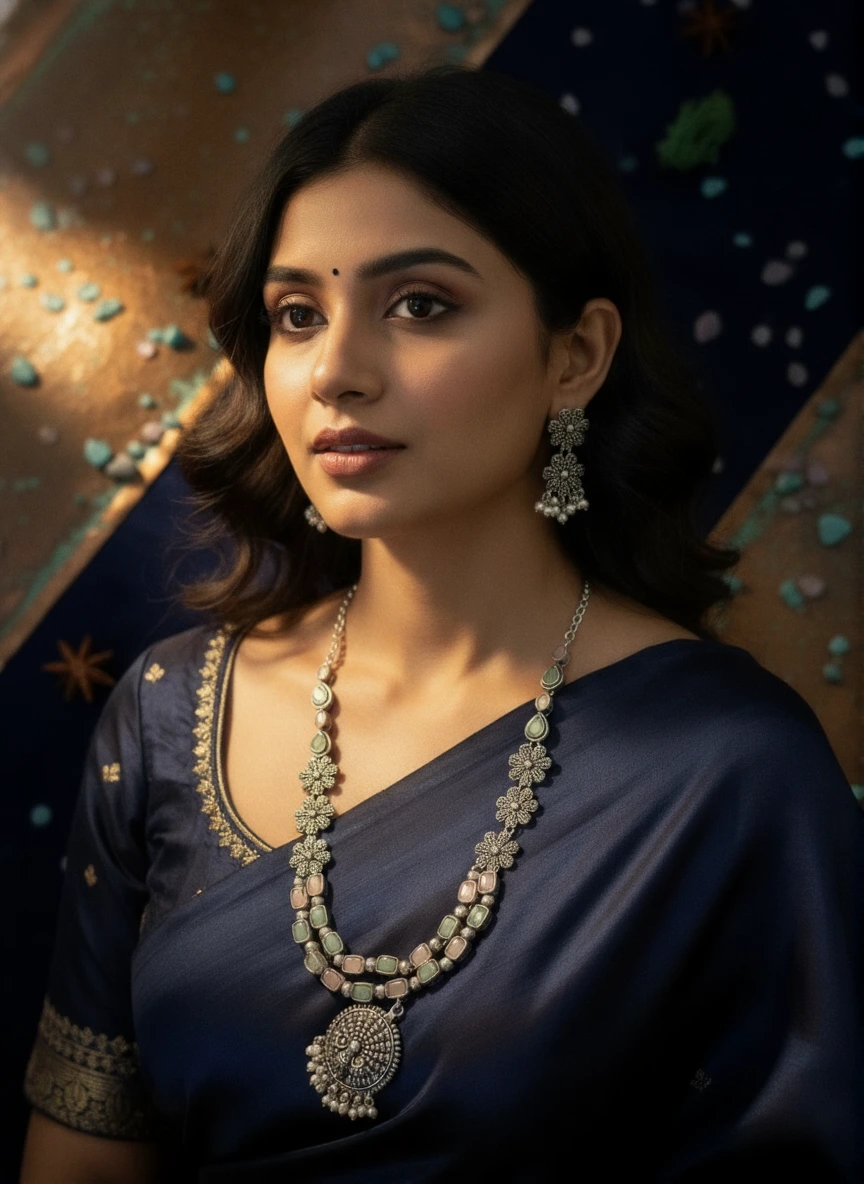 এটি একটি লম্বা নেকলেস, যাতে অক্সিডাইজড ফ্লোরাল (ফুল) মোটিফ এবং গোলাপী ও সবুজাভ রঙের ছোট পাথরের পুঁতি রয়েছে। নেকলেসের নিচের দিকে একটি গোলাকার নকশা করা লকেট রয়েছে, যেখানে ছোট মুক্তোর (pearls) মতো দুল ঝুলছে।