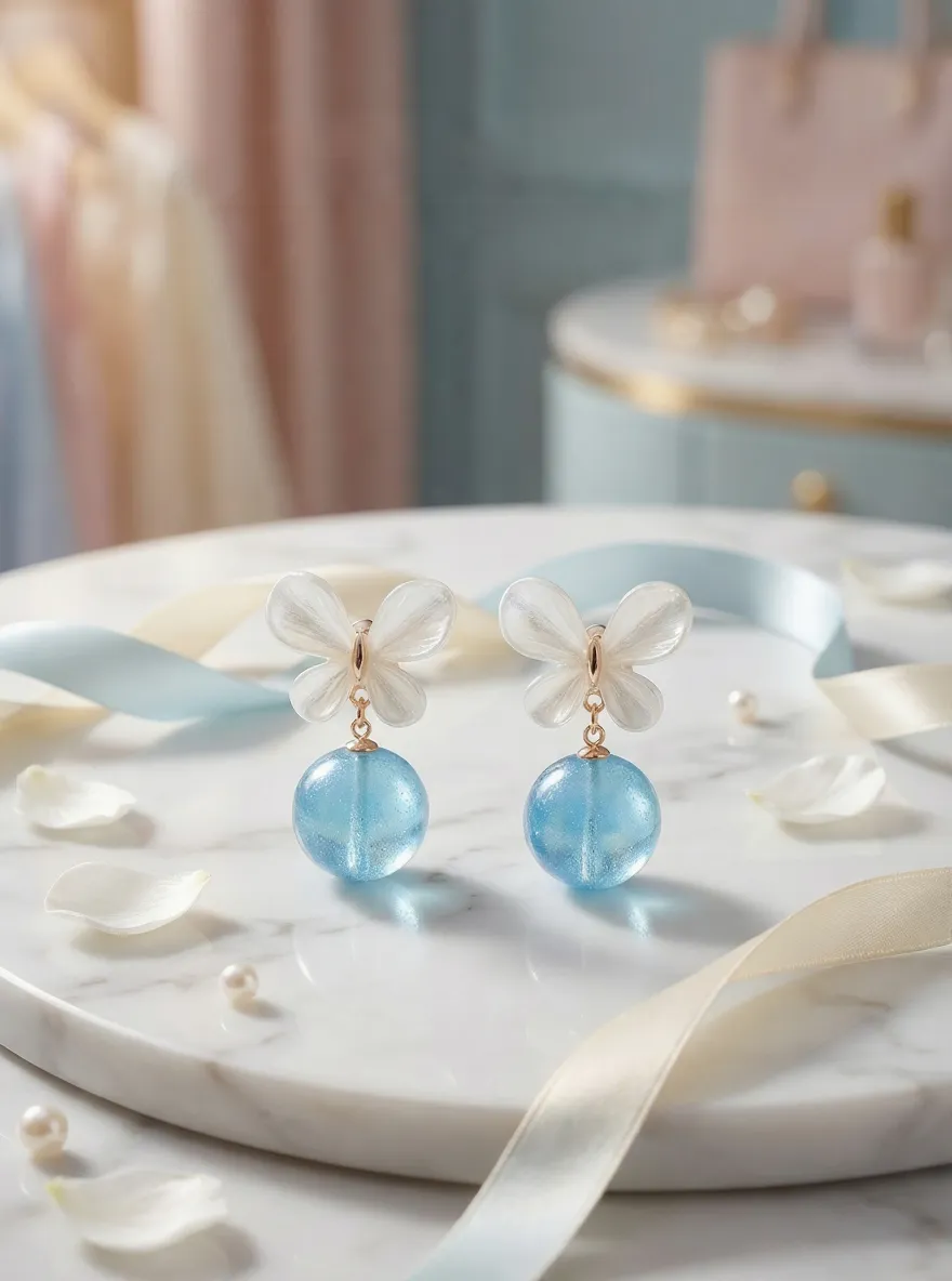 ডিজাইন: দুলটির উপরের অংশে চারটি পাপড়িযুক্ত একটি ফুল বা         প্রজাপতির (Butterfly) আকৃতি রয়েছে, যা ম্যাট ফিনিশের। এর ঠিক নিচেই একটি বড় গোলাকার বল বা পুঁতি ঝুলানো আছে।