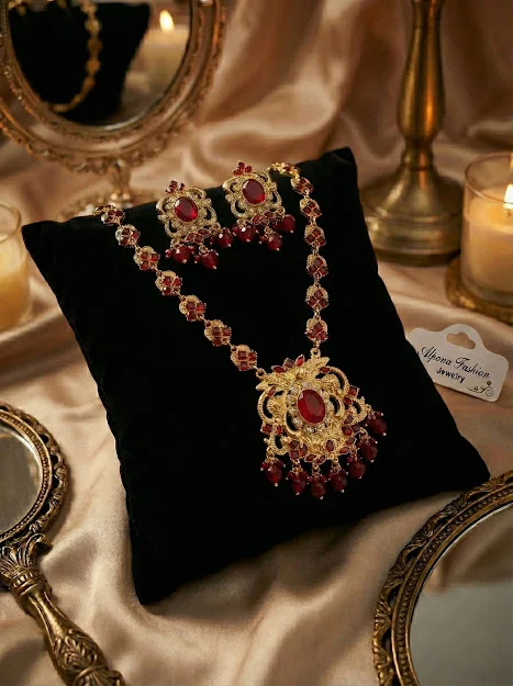 গহনার ধরণ ও ডিজাইন এটি একটি ঐতিহ্যবাহী অলংকার সেট (Traditional Jewelry Set) যাতে একটি লম্বা নেকলেস এবং এক জোড়া ম্যাচিং কানের দুল রয়েছে।